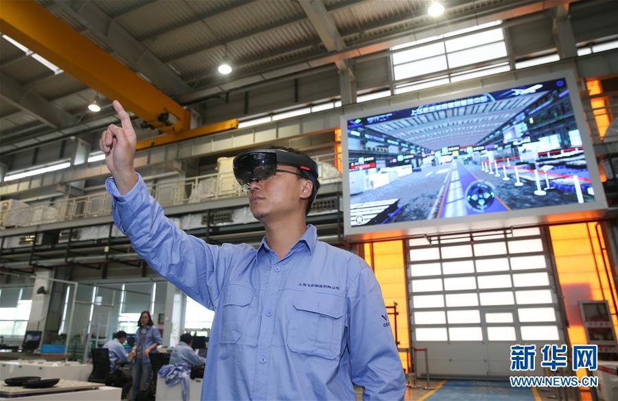 工作人员在中国商飞公司总装制造中心智慧数控车间使用AR眼镜操控虚拟电子屏幕(5月5日摄)。新华社记者丁汀摄