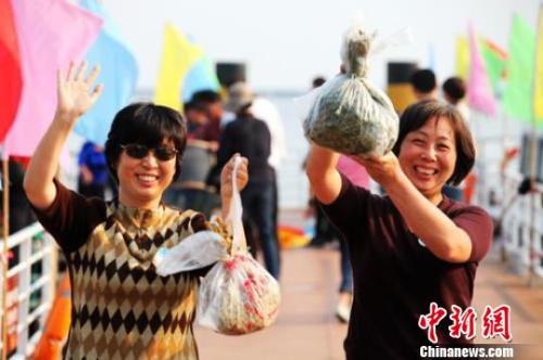 资料图:两位女游客手举获赠的阳澄湖大闸蟹,开心不已。 李克祥 摄