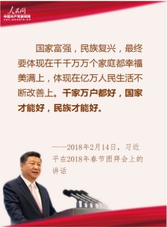 团聚最喜悦,团圆最幸福,团结最有力。春节是万家团圆的日子。中华民族历来重视家庭,家和万事兴。国家富强,民族复兴,最终要体现在千千万万个家庭都幸福美满上,体现在亿万人民生活不断改善上。