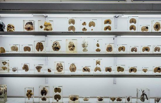 博物馆所展出的大脑器官通?;加欣夏瓿沾糁?、帕金森症、精神分裂症等各类疾病,有的还会出现溢血症状。除此之外,人体的其他部位也会向公众展出,如重度吸烟者的肺部、胰腺、肾脏、心脏、喉头以及完整的骨架。