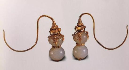 又见明代晚期白玉葫芦形耳坠,出土于卢湾区打浦桥明墓。葫芦形耳坠是江浙一带明代中期以后流行的耳饰。耳坠以白玉雕制葫芦为造型,在其钮头和底部配置金叶,富丽典雅,极为精细。