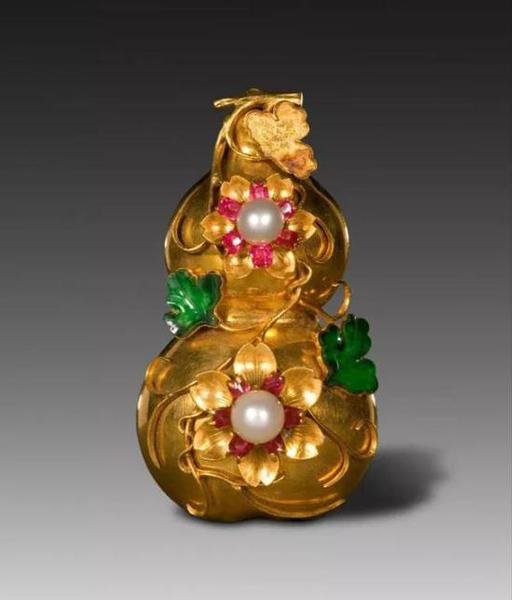 故宫博物院藏清代金嵌珠石葫芦式别针,做工精致配色浓郁,珠光宝气。