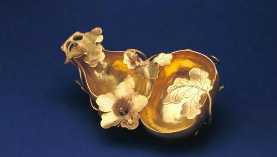 故宫博物院藏清代金质葫芦,八成金质,以半个剖开的葫芦为造型,器外葫芦藤叶缠绕,并有盛开的花朵,花瓣上还趴着一只小小昆虫,颇似天牛。此器一对,做工精致,为清代中晚期陈设用品。
