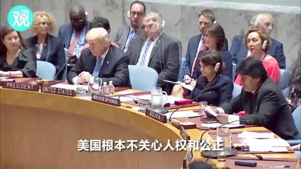 在美国、法国、波兰和赤道几内亚代表发言后,轮到玻利维亚总统莫拉莱斯发言。莫拉莱斯利用这个与特朗普面对面的机会,对美国外交政策的失败进行了一番指责。