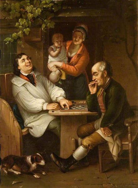 在16-17世纪,绘画中出现了很多描绘下棋场景的作品。其中,有一些着重表现了对战双方的优雅和智慧,如埃奇·派恩(Edge Pine)晚年的作品《西洋双陆棋三人组》(The Backgammon Trio)——但在更多的作品中,下棋被表现为农民赌博的工具。此类作品的场面大多粗俗,比如奥斯塔德(Ostade)的《有西洋双陆棋的酒馆》(Tavern with Tric-Trac of Backgammon)。这种桌游活动,往往伴随着酗酒、斗殴甚至淫乱。