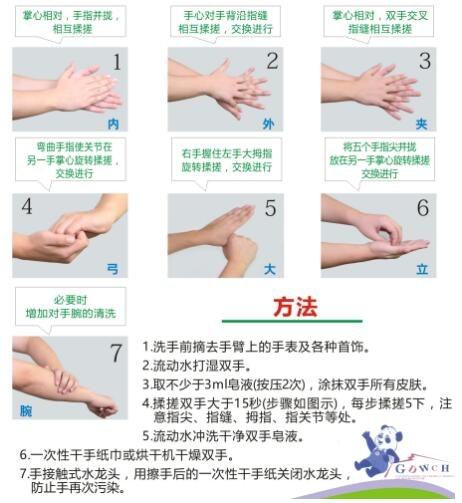 第三,要注意洗手,饭前、便后、回家后、看护儿童前、更换尿布,处理粪便后均要洗手,洗手后不要共用擦手布,洗手方法见图4、5。