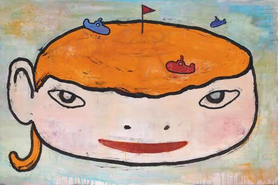 《女孩与潜水艇》中,奈良美智挥别了繁复的叙事方式,对比于1985 至1990 年代初期的创作,如与《精神错乱》(1985 年)、《云上的人》(1989 年)相较,他将带有时、地、物的背景空间描述进行减法的功夫,仅以相近黄绿、蓝、粉的色彩变化、相互交融,以简驭繁地创造出一个单纯的背景空间,而人物在此被放大,主角的地位明确地被提升—一个小女孩的大脸,占满整个画幅,像被变形而压缩成宽扁的脸庞上,两只如娃娃鱼般分得很开的眼眸正与我们对望,咧嘴而笑,透露出莫名的滑稽感,瞬间攫取了观者的注意力,而艺术家特别在女孩头顶橘色的发间正中心安插一只红旗,巧妙地把顶上天地转换成球场,或世界地图上的图景,而三艘潜水艇在一旁来回逡巡,一下子把现实与想象的疆界连接了起来。展现了奈良在创作上的自信、纯熟与天马行空的奇想。