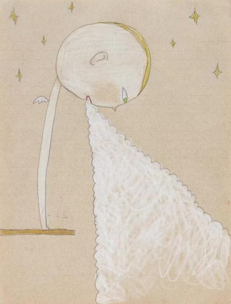 《谁把婴儿偷走了》,完成于2001 至2002 年,该时期奈良美智花了很多时间在旅行上,并受日本Foli 杂志创刊号的邀请,前往阿富汗进行以‘不要战争’(No War)为主题的摄影计划。在阿富汗一个月的行旅间,奈良到访了许多的难民营,亲身感受了当地居民的担忧、害怕与无奈,以及在黑暗的苦难中怀抱希望、善良的人性光辉,让他感触良多,行旅间除了摄影外,他随手用可得的信纸画下了此作。作品中我们可以看到在夜晚星空灿灿的楼台上,有个背上带有翅膀的孩子像个小天使般伫立其间,他目光澄澈地低头望着地面,象是在倾诉着什么,口中的话语被意象化地转为一阵烟云。彷彿正对人间诉说着他的疑问、讲述着那些还没来得及完成与实现的人生种种?,作品真切地诉说了奈良对于身处战海烟云下,那些‘来不及长大’的无辜孩童之深切关怀,别有一番深意。