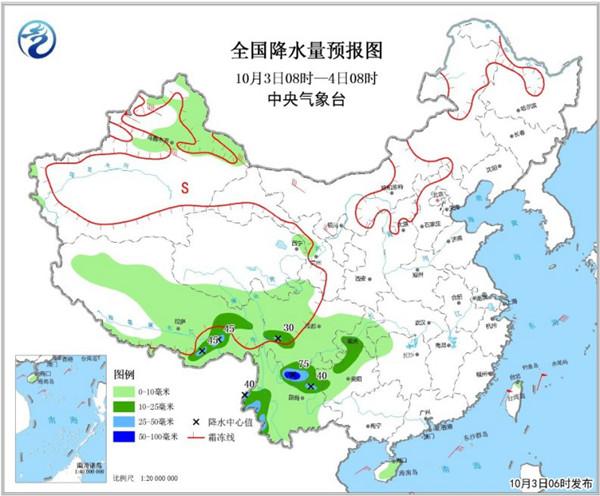 今天,西南地区局地的强降雨将有所减小,主要以小到中雨为主。新疆北部受到冷空气影响,今天也会有些雨雪天气自西向东铺展,白天这一带的降水还不多,夜间开始发展。中央气象台预计,10月3日08时至4日08时,西南地区大部、新疆北部、西藏中东部等地的部分地区有小到中雨,其中,西藏东南部、云南西部和北部、四川西南部等地局地大雨或暴雨(50~75毫米)。