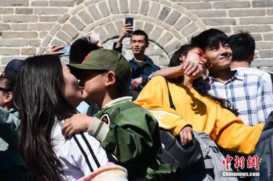 10月6日,国庆假期进入尾声,北京八达岭长城游人依然众多。图为八达岭长城北八楼前人们纷纷拍照留念,来自河南的游客陈女士与孩子亲吻。 中新社发 湛超越 摄