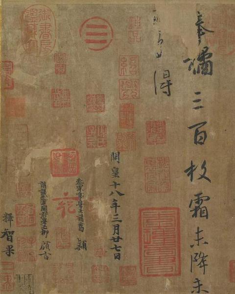 王羲之的《平安》、《何如》、《奉橘》三帖均为尺牍,被装裱在一个手卷之中, 前隔水有宋徽宗题款“晋王羲之奉橘帖”。但此三帖并非王羲之真迹,为双钩摹本。米芾《书史》中记载“又有唐摹右军帖,双钩,蜡纸摹。末后一帖,是‘奉橘三百颗,霜末降,未可我得’。韦应物诗云:‘书后欲题三百颗,洞庭更待满林霜’。盖用此事。开皇十八年三月二十七日,参军学士诸葛颖、咨议参军开府学士柳顾言、释智果跋其尾?!?/p>