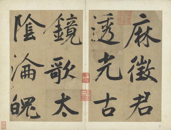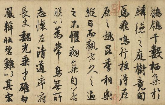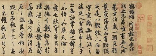 展览中,一直被视为唐玄宗李隆基唯一存世的书法真?!耳W鴒颂》。文中描写了当时宫廷里的情景。某年九月,一千余只鶺鴒飞到宫廷庭院游玩,过了十天这些鶺鴒仍不离去,最后终于亲近得连在旁边拍手它们也不会飞走,于是玄宗邀请了五位臣子在这金秋季节共同度过了愉快的一天。后面又有蔡京、蔡卞、王文治等人的题跋,还有众多重要的收藏印。宋人赵明诚《金石录》中记载:“唐鶺鴒颂,明皇撰并书?!?/p>
