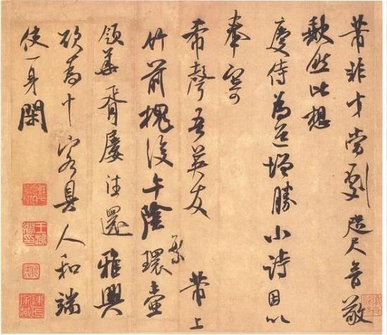 在书法圈里,名人尺牍近年来越来越热。大都因为其形式不加修饰、不做作,为其真情实感的流露所打动。前面提到的王羲之《平安》、《何如》、《奉橘》三帖均为尺牍,此次展览中米芾、苏轼的书法作品也是尺牍作品。其中,米芾《致希声吾英友尺牍并七言诗》共九行,六十一个字,所书内容为:芾非才当剧,咫尺音敬缺然,比想庆侍,为道增胜,小诗因以奉寄。希声吾英友。芾上。竹前槐后午阴繁,壶领华胥屡往还。雅兴欲为十客具,人和端使一身闲。
