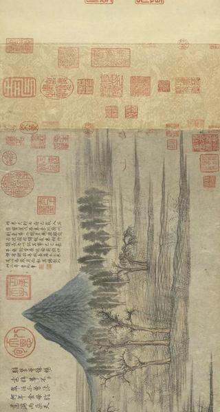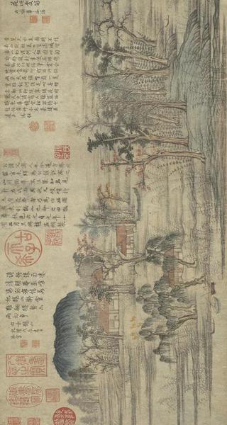 有意思的是,此卷又和乾隆皇帝有着“欢喜冤家”般的故事。乾隆十三年(1748),乾隆皇帝巡狩济南,闲暇里登上城门远眺,觉得这一带景色似曾相识,突然回想起这是《鹊华秋色图》中的景色,心中大喜。他连忙急命飞骑去京城禁中取来,对着鹊、华二山展卷对观,一番赞叹不绝之后,发现所画之景与现实中不相符,于是将此卷深藏内府,不复观。然而当他再次巡幸济南时,又一次想起了宫中的《鹊华秋色图》。面对美景,念及名画,他早已把上次的事忘得一干二净,于是下旨又一次派人回宫取画,且又在画上题写了“深情”的一跋。