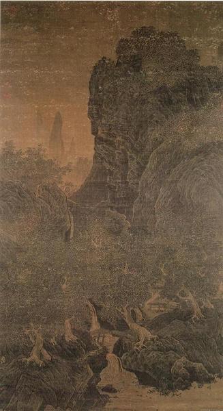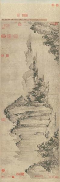 夏珪的《溪山清远卷》可以说是代表了整个南宋山水画,“水墨氤氲、构图空灵”既展现了南宋的山水画特点与审美趣味,又映证了“夏半边”的经典图式。而这种一角山水的形成,除了自然环境、政治因素的影响之外,离不开画家的一脉相承。这中间至关重要的人物就是李唐,而萧照就是李唐的学生。李霖灿先生认为,萧照的《山腰楼观图轴》轴看似不起眼,但是它继承了李唐《万壑松风图》的笔法,更重要的是这幅画在章法上有了新的改变。即画面的主体由北宋以来中央式的全景构图中慢慢偏移到画面左边边沿,摇身一变成为了开启南宋“边角式”的代表。