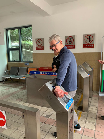 在轮渡检票口,库克用自己的Apple Watch熟练地刷了上海公交卡登船。苹果的Apple Pay支持上海公交系统刷卡,iPhone和Apple Watch 可以刷公交车、轮渡和上海绝大部分出租车。