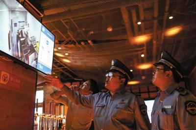 西城区食药监局大栅栏街道食药所执法人员检查"阳光餐饮"工程中"视频厨房"落实情况。浦峰 摄