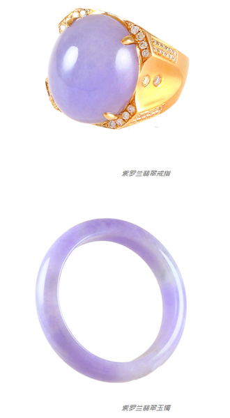 紫色翡翠又称为紫罗兰翡翠,产量稀少,其颜色如紫罗兰花般娇艳,因而得名,另外也将紫罗兰翡翠称为‘椿’或‘春色’,其颜色可分为:皇家紫(又称茄紫)、粉紫及蓝紫,其中等级最高为皇家紫。