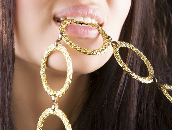 1、 首先要适当用力咬一下金饰。