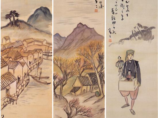 竹久梦二 海边的太阳、江畔秋景、木偶(三条屏) 设色绢本立轴 日本竹久梦二伊香保纪念馆收藏