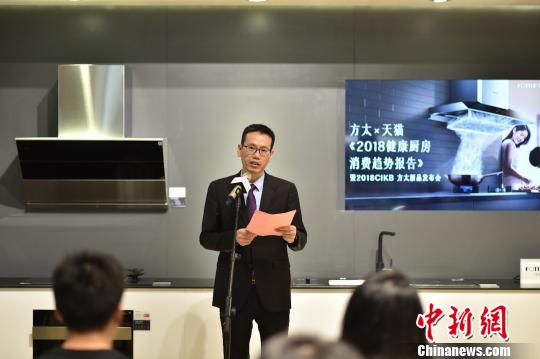 2018中国国际五金展10日至12日在上海举行。图为方太副总裁孙利明在展会期间介绍《2018健康厨房消费趋势报告》?!≈有馈∩?/p>