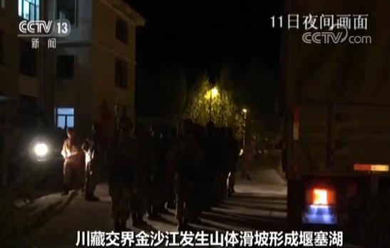 10月11日下午,接到灾情命令,西藏军区昌都军分区迅速按照应急救援方案,准备帐篷、棉被、褥子等救援物资,紧急出动200多名官兵分两路连夜赶往受灾地区。今天一早,先遣部队投入抢险救灾工作。在堰塞湖上游地段,因金沙江干流藏曲河水位持续上涨,导致连接波罗乡两地浮桥被淹没,对岸50多名群众被困,部队官兵协同地方救援力量一起用船只将被困群众转移至安全地域。为防止次生灾害的发生,救援部队官兵就地展开受损道路修复,并派出突击队沿塌方后的山体巡逻观察,排除可能塌方地域,随时做好爆破准备,并对堰塞湖水位实时监控,抓紧一切时间做好水位继续上升的引流准备。