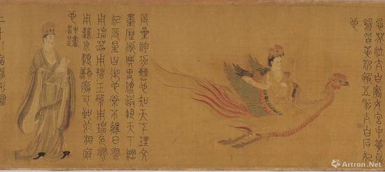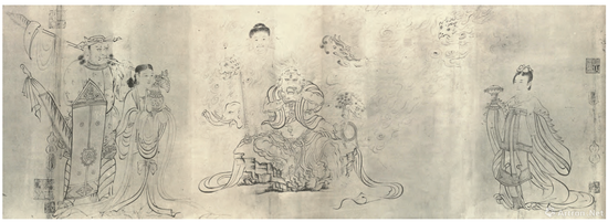日本大阪市立美术馆收藏吴道子(传)《送子天王图》是当今唯一存世且多为各种美术史著作征引的“吴家样”绘画实例?!端妥犹焱跬肌罚ㄓ置短焱跛妥油肌罚┯商迫宋獾雷铀?,图又名《释迦降生图》,乃吴道子根据佛典《瑞应本起经》绘画,现存此画为宋人摹本。全图分为三个部分:第一段描绘一位王者气度的天神端坐中间,两旁是手执筋板的文臣、捧着砚台的仙女,以及仗剑围蛇的武将力士面对一条由二神降伏的巨龙。第二段画的是一个踞坐在石头之上的四臂披发尊神,身后烈焰腾腾。神像形貌诡异,颇具气势,左右两边是手捧瓶炉法器的天女神人。第三段即《释迎牟尼降生图》,内容是印度净饭王的儿子出生的故事。从画面上,可以看到释迎牟尼降生时,他的父亲抱着他到寺庙朝谒见自在天神的情景。