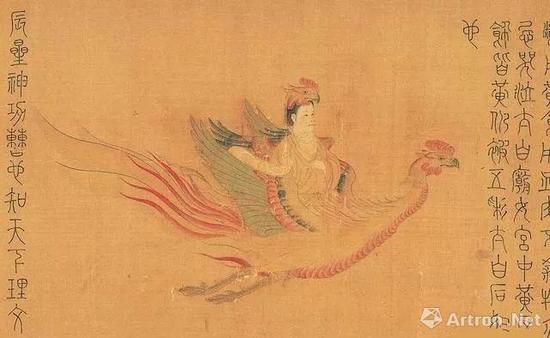 有关宫素然其人生平不详,镇阳属于河北路真定府(今河北省正定县)。而明妃则是汉元帝的妃子王昭君。元帝因嫔妃众多,于是按画工所描绘的宫女姿容来决定召幸与否,其中仅明妃因不愿贿赂画工而被画得很丑,最后被迫嫁给匈奴王。本图即表现强风狂吹、沙尘漫飞的出关场面,画中人物、马匹均采用纤细的白描笔触描绘。另一件传世的张瑀(约活动于12至13世纪)《文姬归汉图》(吉林省博物馆藏)与本作构图大体一致,此点关联十分耐人寻味。