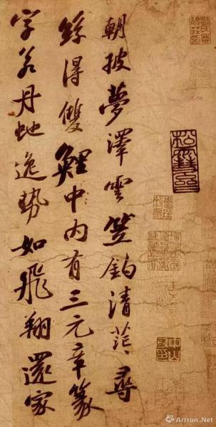 《行书李白仙诗》以行书抄录两首五言古诗,款识“元祐八年七月十日、丹元复传此二诗”。虽然作品未见署名,依据书风判断应出自苏轼之笔,为其五十八岁所书。金代人蔡松年在跋文中写到,据传苏轼是在京师(汴京)遇到身为道士的丹元(姚安世)时,将李白的肖像连同李白所作的诗文一起交给姚氏,但这两首诗并未收录在现存的李白诗集中。此作乃苏轼学颜真卿( 709- -784 )和杨凝式(873- -954) 等人书风又自成一家的中年时期作品,以独特的右肩斜耸笔势书写,用笔富变化,是不拘于琐碎技法、盈溢着跃动感的书迹。