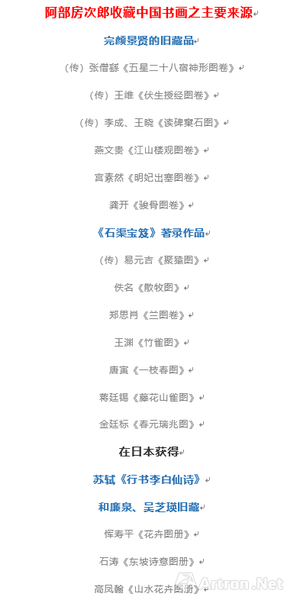 梳理阿部房次郎的中国书画收藏,细心的你会其藏品主要来源有以下三部分——完颜景贤旧藏、石渠宝笈著录(清宫旧藏)和阿部在日本获得的藏品(主要是同好间交换或购藏)。