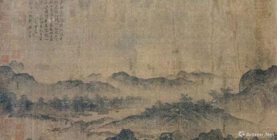 此幅画卷描绘了横向水平展开的广袤山水,从卷首处可远远眺望的江水,一直到卷尾仰之弥高的山体,真切表现了在风雨当中云烟、树木以及水流逐渐变得激烈的场景,画中多处还点绘有人们生活情景。燕文贵(约967—1044)为宋太宗朝宫廷画家,其画风融合了李成、范宽(约活动于10世纪)等人的北方样式,和以董元(约活动于10世纪)为代表的南方样式,并以细致的笔触描绘人物和树石,被称之为“燕家景致”。本图可谓最具知名度且最能体现燕文贵画风的传世名品。