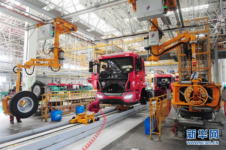 2018年7月12日,技术工人在安徽江淮汽车集团股份有限公司阜阳分公司江淮汽车总装车间生产线上组装卡车。 新华社发(王彪 摄)