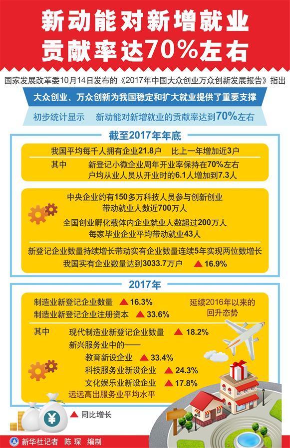 新华社北京10月14日电(记者安蓓)国家发展改革委14日发布的报告指出,大众创业、万众创新为我国稳定和扩大就业提供了重要支撑。初步统计显示,新动能对新增就业的贡献率达到70%左右。