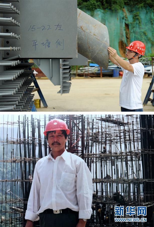 拼版照片:上图为贵州桥梁建设集团工程师刘豪在对平塘特大桥钢锚梁的拉索孔孔径进行检测(9月25日摄);下图为刘豪的父亲刘正华在桥梁施工现场的留影(资料照片)。刘豪是家中第三代桥梁人,他的爷爷、父亲都是贵州桥梁建设者。新华社发(杨文斌 摄)