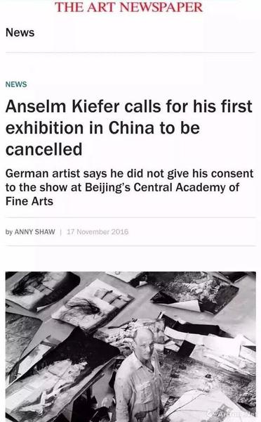 ▲ 来自《艺术新闻》(The Art Newspaper英文版)题为“艺术家安塞尔姆·基弗(Anselm Kiefer)要求取消本次‘基弗在中国’个展”的新闻