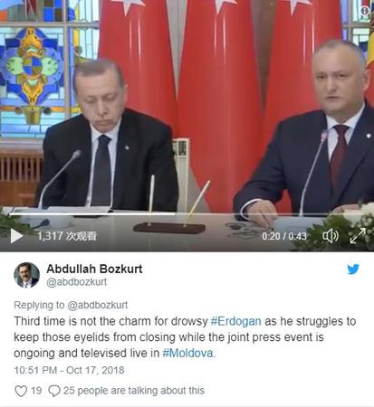 海外网10月19日电 据俄罗斯卫星通讯社消息,当地时间17至18日,土耳其总统埃尔多安对摩尔多瓦进行了为期两天的正式访问,以促进两国之间的关系。在访问结束时,两位总统举行了最后的新闻发布会。一名土耳其记者注意到,这次访问似乎让埃尔多安“很累”。