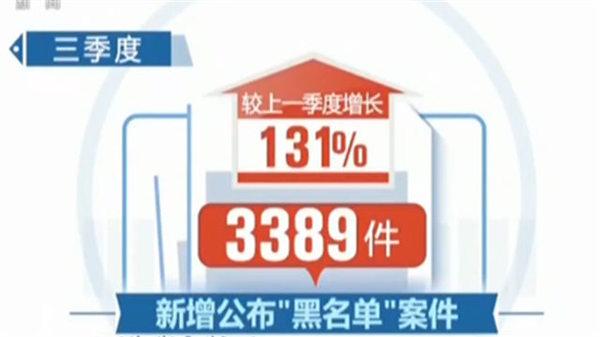 央视网消息:除了两年专项行动外,税务部门还建立了税收违法“黑名单”制度和税收联合惩戒制度,三季度新增公布“黑名单”案件3389件,较上一季度增长131%。