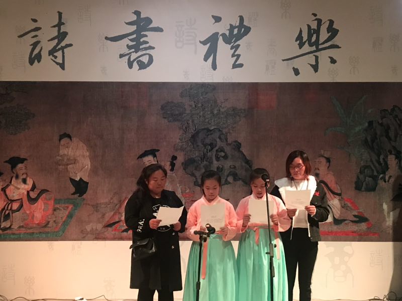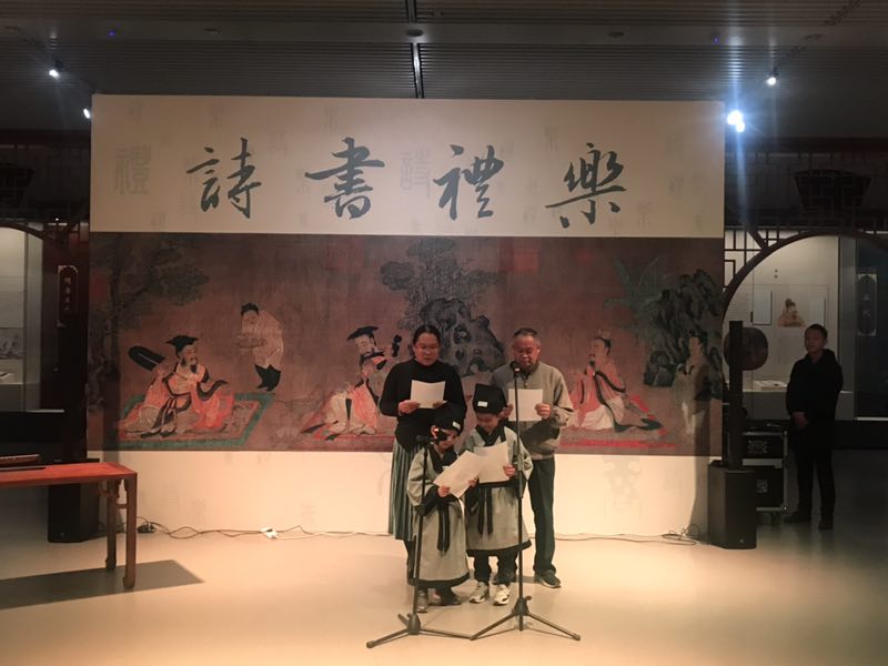 “左琴右书”琴书诵读在“从《诗经》到《红楼梦》——那些年我们读过的经典”展“诗书礼乐”体验区进行。同学们经过专业诵读老师的指导后,身着汉服,伴随着悠扬的古乐,在展厅内朗诵经典诗歌。在古琴伴奏下的诗歌朗诵与“丝路诗路”主题讲解联动,集诵读、游戏、体验、角色扮演于一体,让同学们在学习传统文化的同时,领略到中国古人在诗词歌赋中营造出的美好意境。