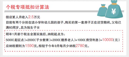 国家行政学院经济学部教授冯俏彬指出,实施细则基本覆盖30-50岁之间的纳税人,他们既是缴纳个税的主体,也是负担相对较重的群体。北京商报记者通过计算发现,对于“上有老下有小”并且身背房贷的中等收入群体而言,新个税法全面实施后,纳税收入起点将明显提高。假设某人为独生子女,父母已满60周岁,目前有两个分别在读小学和幼儿园的孩子,购买的第一套房子正在还贷期间,他的月收入扣除“三险一金”为2.5万元, 那么,在减去专项附加扣除后,他的纳税起点将从今年9月的3500元提高到明年1月的1万元,相对应的纳税额则从4370元下降至1590元,每月少纳税2780元。