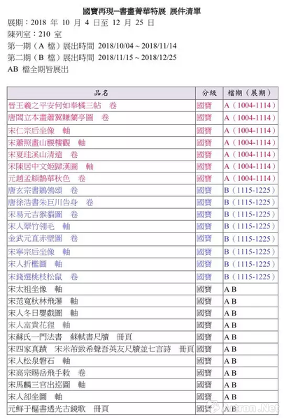 但在这些“国宝”中,也有些微的差别,一些“国宝”可能经常会和大家见面,但另外一些作品由于文物?;?、历史价值等原因,只能隔段时间才能与观众见一次面,这类“国宝”被称为限展国宝,就如以上展览清单中分别在A期限展的七件国宝和B期限展的八件国宝,就都属于珍贵的“限展国宝”级别。