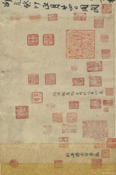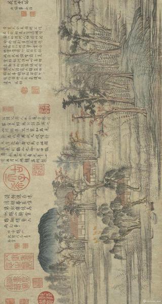 就印章、题跋来说,《鹊华秋色图》五米长的画卷,四米都是题跋。仅乾隆皇帝的印章就二十多个!可见其对《鹊华秋色图》的喜爱?!堆屿ヂ浴返墓适虏豢煽?,但此卷还真和乾隆皇帝有着“欢喜冤家”般的故事。乾隆十三年(1748),乾隆皇帝巡狩济南,闲暇里登上城门远眺,觉得这一带景色似曾相识,突然回想起这是《鹊华秋色图》中的景色,心中大喜。他连忙急命飞骑去京城禁中取来,对着鹊、华二山展卷对观,一番赞叹不绝之后,发现所画之景与现实中不相符,于是将此卷深藏内府,不复观。然而当他再次巡幸济南时,又一次想起了宫中的《鹊华秋色图》。面对美景,念及名画,他早已把上次的事忘得一干二净,于是下旨又一次派人回宫取画,且又在画上题写了“深情”的一跋。
