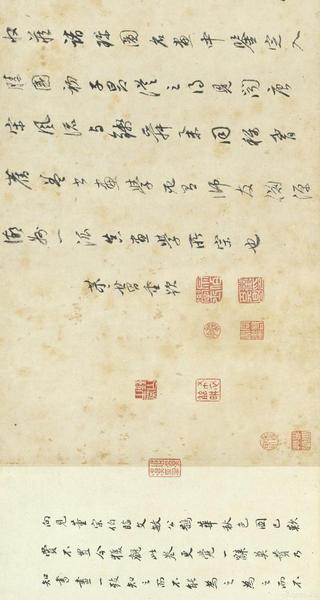 其中,米芾《致希声吾英友尺牍并七言诗》共九行,六十一个字,所书内容为米芾写给黎錞(字希声)的一封信札。信中开头提到:“非才当剧”(我不是人才却担当大任)这句话,透露出米芾第一次出任地方行政首长,戒慎恐惧的心情。然而,在诗中米芾也回忆起数年前与朋友相聚,共游山川、玩赏文物,或是雅集盛筵的欢乐情景。这种闲适自得的心情,与即将接踵而至的繁忙政事,形成强烈的对比。
