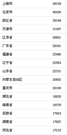 上海也是前三季度人均可支配收入突破4万元大关的仅有的两个地区之一,另一个是北京,为46426元。
