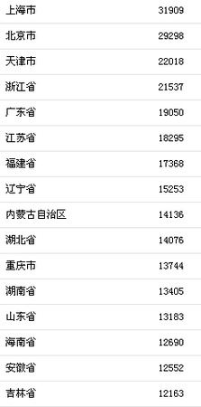 国家统计局公布的31省份居民人均可支配收入显示,上海、北京、浙江前三季度居民人均可支配收入排名前三。