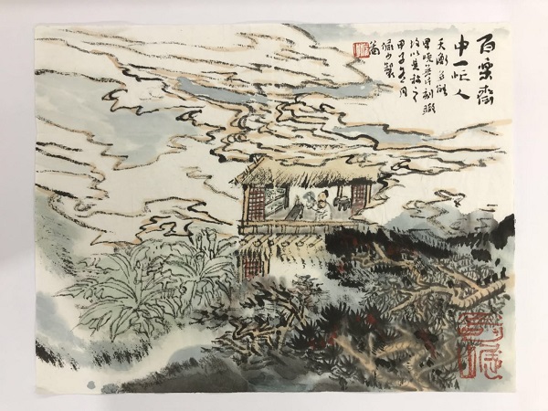 展览中,六大家的作品数量以陆俨少作品为最多,且无论是其册页作品、立轴作品,还是手卷作品,无不体现了以元人笔墨写造化之境的山水画精髓。尤其是《峡江险水图卷》,此卷前有林散之题,后有商承祚跋,是陆俨少1966年写貌三峡之作。众所周知,1945年陆俨少自巴蜀之地举家东归,由于火车票、飞机票紧张,画家携全家搭乘民工之木筏顺江而下,一路虽惊险,但得幸一睹三峡之奇特面貌,故而返沪之后,陆俨少屡写峡江险水图。此卷便是其一?;碇凶允贾廖?,俨然一气呵成,群峰高耸,江水急湍,在画家顺势而为的笔墨之下,表现得淋漓尽致。除了此卷,《豆庐室治印图册》、《峡江图》、《采药图》也是体悟陆俨少对传统笔墨继承与发扬的极好范本。