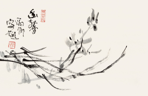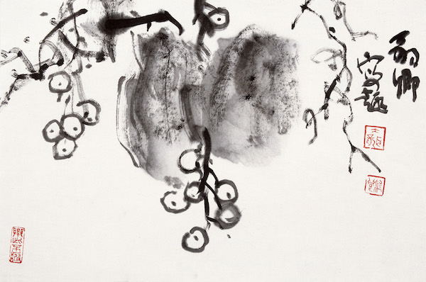 了悟这一切的豹翁在八旬以后,一些作品已近乎化境,尤其是随着他读书的广博与对黄宾虹、徐生翁、弘一书法以及唐以前摩崖碑刻书法取法的深入与消化,笔墨渐入苍茫之境,笔线方圆结合,在花卉写意中将宾翁的宿墨法、焦墨法与淡墨、渴笔乃至水韵神奇地融为一体,了无痕迹,浓淡枯湿尽皆自然,寓苍莽于平淡之中,在笔墨的深度与浑厚、简约的把控上,推进了一大步,形成自己独有的风格——对求简而直见心性的中国写意笔墨而言,这实在可以说是了不起的一步。