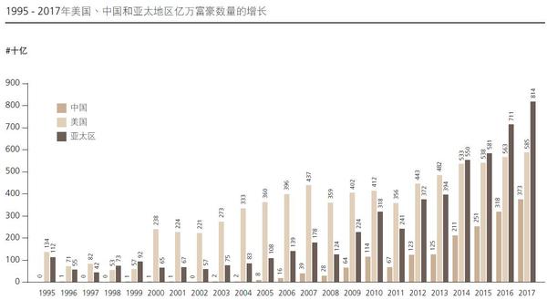 报告显示,2017年,199名白手起家的企业家首次成为亿万富豪,其中美国有30名,而中国有89名,这一数字是美国的3倍。这些新晋白手起家的亿万富豪中,近三分之一(30%)通过创新和改变商业模式积聚财富,而其余人则通过扩大业务积聚财富,特别是在亚太地区的巨大市场(如中国、印度和印度尼西亚)扩大业务。