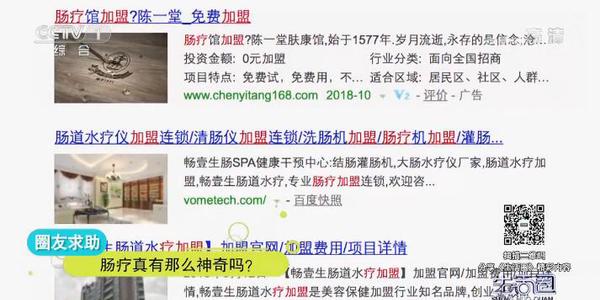通过网上搜索记者发现,关于肠疗的信息不少,既有宣传肠疗养生会馆,也有肠疗招商加盟的信息。有些商家宣称:人体进行肠疗不但会对肠道进行保养和修复,而且能够排出体内毒素,有滋润肠道的功效,还能够呵护人体内环境。