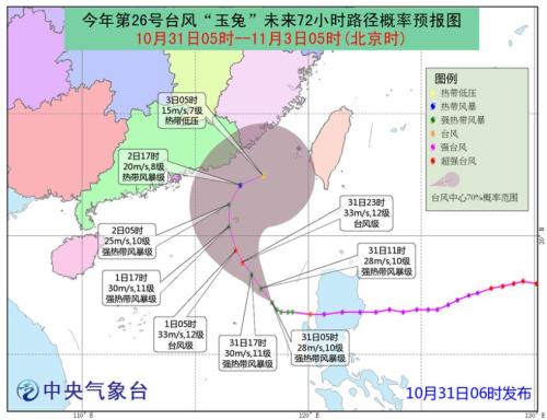 预计,“玉兔”中心将以每小时15公里左右的速度向西北方向移动,强度维持或略有增强,11月1日以后逐渐转向偏北方向移动,移速减慢,强度明显减弱,之后将在南海北部海面减弱消失。