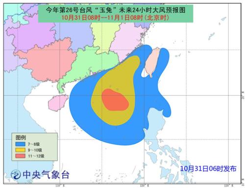 图2台风“玉兔”大风预报图(10月31日08时-11月1日08时)图片来源:中央气象台网站